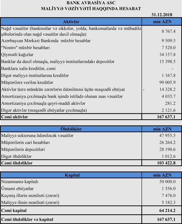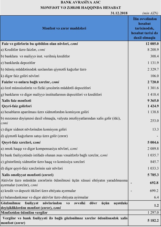 “Bank Avrasiya” ASC 2018-ci ili 5 milyon 182 min manat xalis mənfəət ilə başa vurub.