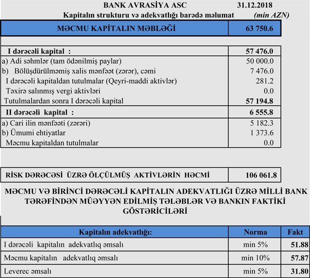Ötən il “Bank Avrasiya”nın cəmi banlans kapitalı təxminən 8,9% artaraq 64 milyon 214 min manata, məcmu kapitalı isə 9% artaraq 63 milyon 750 min manata yüksəlib. Bankın kapital adekvatlığı normadan dəfələrlə yüksəkdir. Qeyd edək ki, banklara qarşı rəsmi minimal məcmu kapital tələbinin məbləği 50 milyon manatdır.