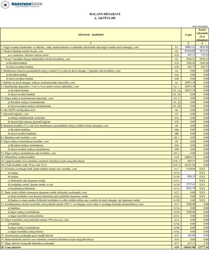 31 Dekabr 2018-ci il tarixində “Naxçıvan Bank” 196 milyon 541 min manat cəmi aktivlərə, 118 milyon 357 min manat cəmi öhdəliklərə və 78 milyon 183 min manat cəmi balans kapitalına malik olub. Aktivlərin 64 milyon 854 min manatını müştərilərə verilmiş kreditlər təşkil edib. Eyni zamanda, Bankın aktivlərinin 81 milyon manatını Mərkəzi Bankdakı müxbir hesabdan ibarət olub. Bundan başqa, “Naxçıvan Bank” digər banklara 20 milyon 973 min manat depozit yerləşdirib.