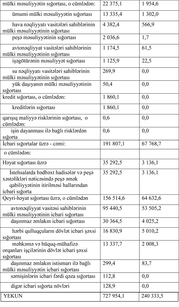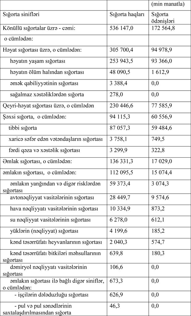 Könüllü sığorta bazarı üzrə haqlar 536.2 mln. manat, ödənişlər isə 172.5 mln. manat təşkil edib. İcbari sığorta bazarı üzrə haqlar 191.8 mln. manat, ödənişlər isə 67.8 mln. manat olub.