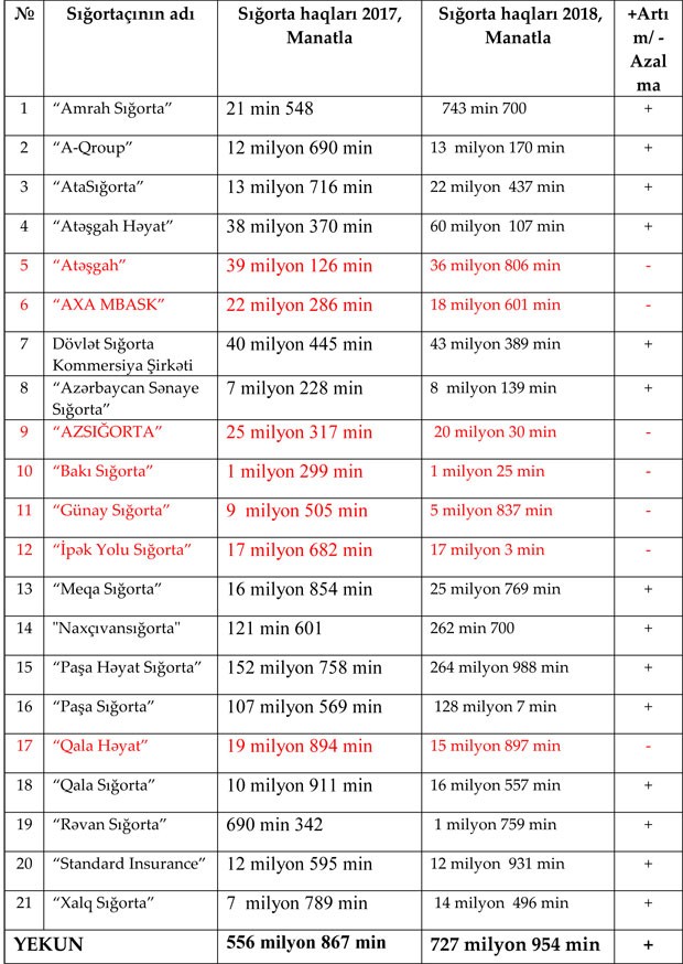 2016-cı illə müqayisədə 2017-ci ildə 21 sığorta şirkətindən 10-nun topladığı sığorta haqları azalmışdı. Həmin “A-Qroup Sığorta Şirkəti”,“Atəşgah” Sığorta, Dövlət Sığorta Kommersiya Şirkəti, “Mega Sığorta”, “Qala Həyat” Sığorta Şirkəti , “Rəvan Sığorta”, “Standard Insurance”, “Xalq Sığorta”, “İpək Yolu Sığorta” və “Amrah Sığorta” şirkətinin yığımları azalmışdı.