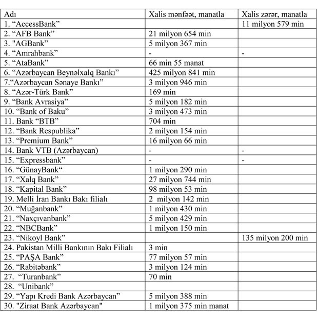 24 bank mənfəət, 2 bank zərər açıqlayıb - SİYAHI