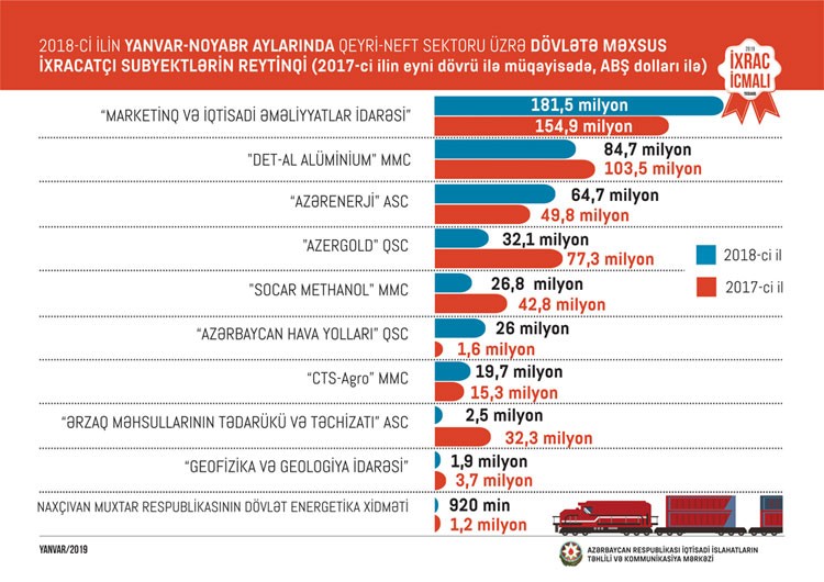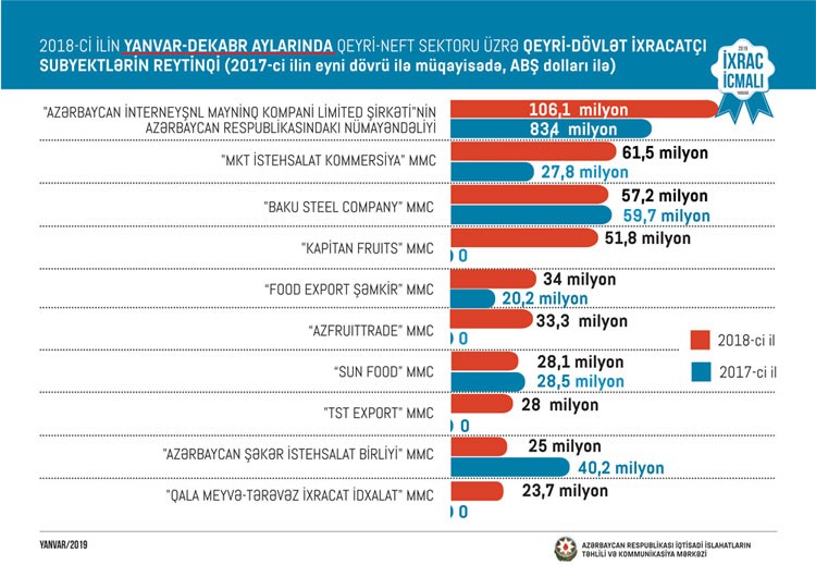 “İxrac İcmalı”nın yanvar sayında qeyri-neft sektoru üzrə əsas ixracatçı subyektlərin reytinqi də verilib. 2018-ci ilin yanvar-dekabr ayları üzrə hazırlanan qeyri-dövlət ixracatçı subyektlərin reytinqində ilk onluqda aşağıdakı subyektlər təmsil olunurlar: