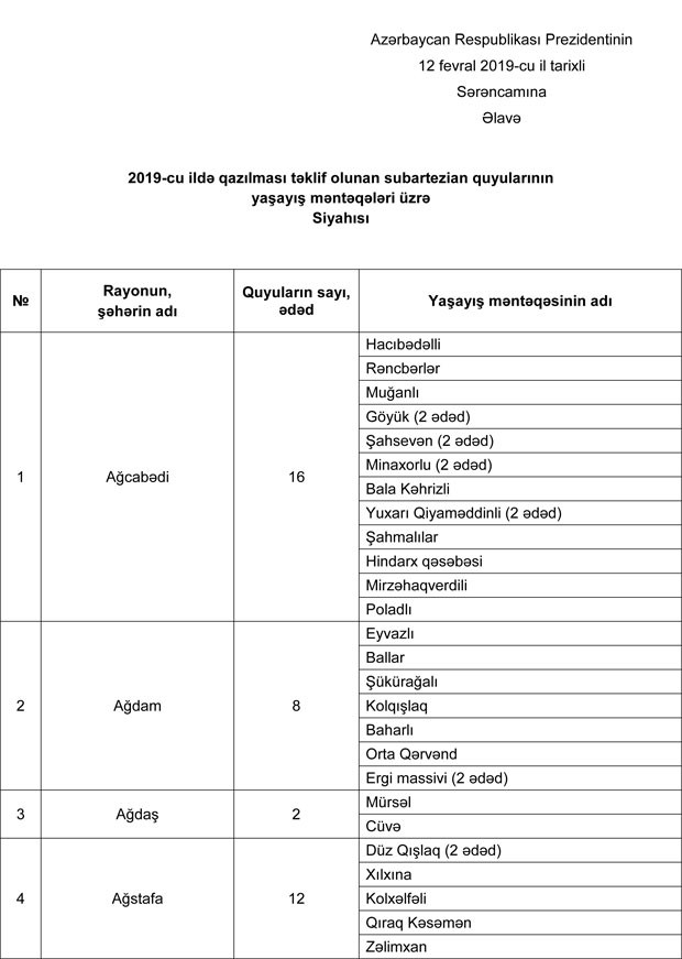 "Marja" xəbər verir ki, Sərəncama əsasən, əhalisi 736 min nəfərə yaxın olan 41 şəhər və rayonun 254 yaşayış məntəqəsində əkin sahələrinin və əkin üçün istifadə olunan həyətyanı torpaq sahələrinin suvarma suyu ilə təminatının yaxşılaşdırılması, yeni suvarılacaq torpaqların suvarma suyuna, habelə əhalinin içməli suya tələbatının ödənilməsi üçün 2019-cu ildə 300 subartezian quyusunun layihələndirilməsini və qazılmasını təmin etmək məqsədilə dövlət büdcəsindən Azərbaycan Meliorasiya və Su Təsərrüfatı Açıq Səhmdar Cəmiyyətinə 21 milyon manatı ayrılıb.