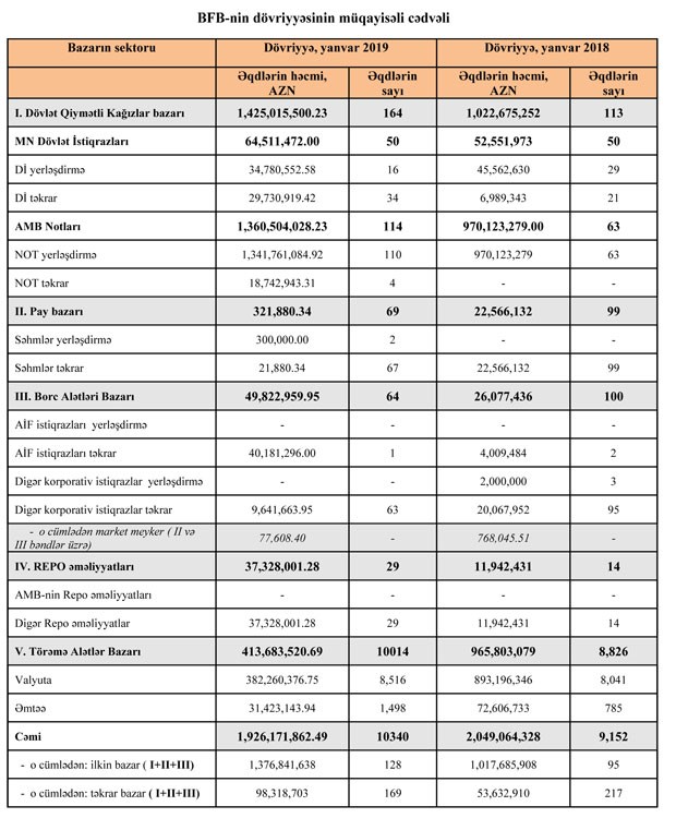2019-cu il yanvar ayı ərzində Bakı Fond Birjasında bütün alətlər üzrə keçirilən əqdlərin ümumi həcmi 1 milyard 926 milyon 172 min manat təşkil etmişdir.