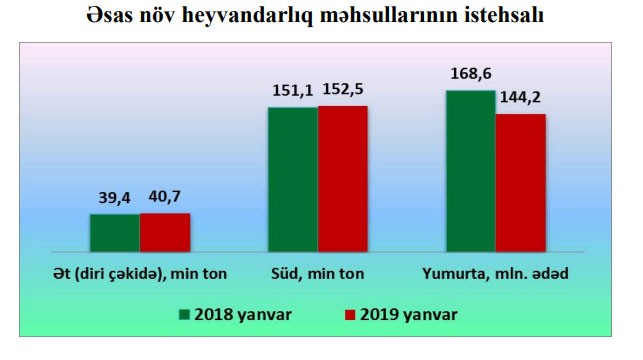 2019-cu ilin yanvar ayında diri çəkidə 40,7 min ton ət, 152,5 min ton süd, 144,2 milyon ədəd yumurta, 15,6 min ton tərəvəz istehsal olunmuşdur.