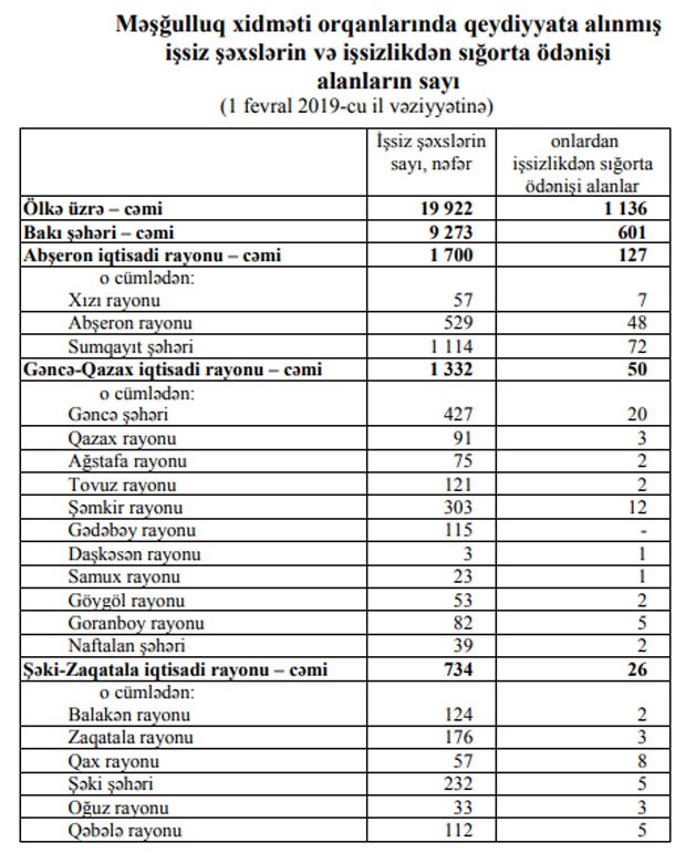 Azərbaycanda ən az işsiz Daşkəsəndə (3 nəfər), Bakı xaric ən çox işsiz isə Ağdamdadır (690 nəfər).