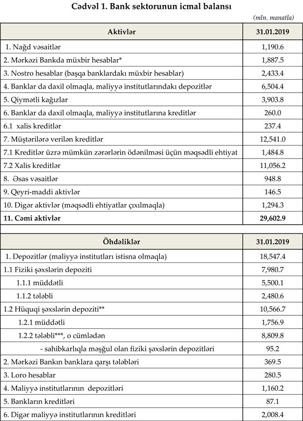 31 yanvar 2019-cu il tarixinə bank sektorunun əsas göstəriciləri bank sektorunun icmal göstəricilərində öz əksini tapıb.