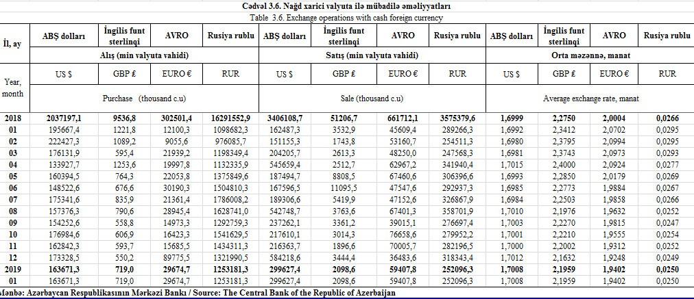 Ötən ilin Yanvar ayı ilə müqayisədə 2019-cu ilin Yanvar ayında Dolların alışı azalıb, satışı isə artıb. 2018-ci ilin Yanvarında alış 195 milyon 667 min dollar, satış isə 162 milyon 487 min dollar təşkil etmişdi.