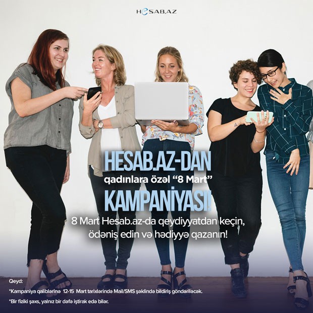 Belə ki, 8 Mart tarixinə kimi qeydiyyatdan keçən və ya artıq qeydiyyatı olan xanım istifadəçilər Hesab.az portalında 8 Mart tarixində bir dəfəyə 20 AZN və yuxarı ödəniş edərək (Bank, sığorta və online bilet ödənişləri istisna olmaqla), 10 AZN dəyərində Hesab.az hədiyyə kartı qazanıblar.