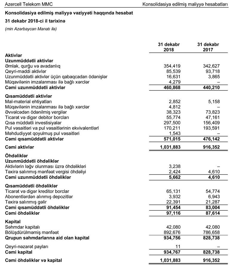 31 Dekabr 2018-ci il tarixində “Azercell Telecom” MMC-nin cəmi aktivləri 1 milyard 32 milyon manat təşkil edib. Bu, ötən ilin yanvarın 1-i ilə müqayisədə 12,6% çoxdur. 2018-ci ildə “Azercell Telecom”un cəmi öhdəlikləri 10,85% artaraq 97 milyon 116 min manata, cəmi kapitalı isə 12,8% artaraq 934 milyon 767 min manata çatıb.