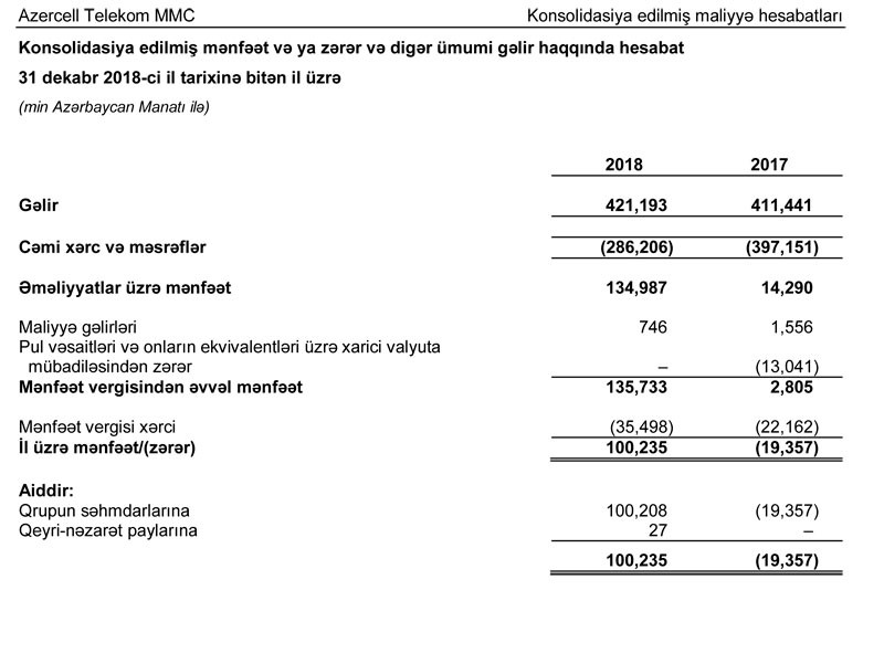 Dövlət şirkəti “Azercell Telekom” MMC 2018-ci ili 100 milyon 235 min manat xalis mənfəətlə başa vurub. Şirkət 2017-ci ili 19 milyon 357 min manat zərər ilə bağlamışdı.