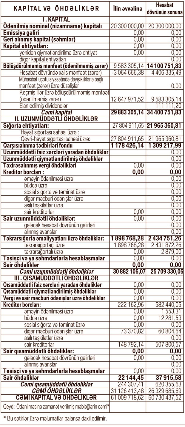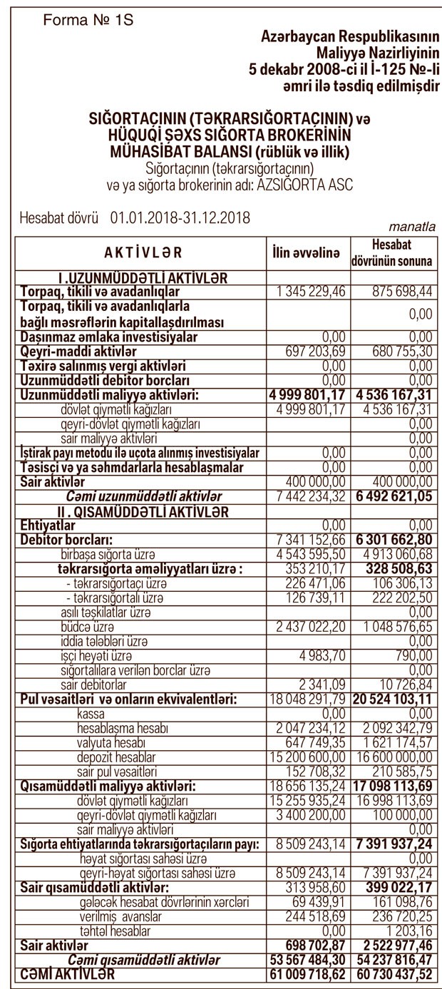 31 Dekabr 2018-ci il tarixində “Azsığorta” 60 milyon 730 min manat cəmi aktivlərə, 26 milyon 329 min manat cəmi kapitala və 34 milyon 400 min manat cəmi öhdəliklərə malik olub. 31 Dekabr 2017-ci il tarixində “Azsığorta” 61 milyon 9 min manat cəmi aktivlərə, 29 milyon 883 min manat cəmi kapitala və 31 milyon 126 min manat cəmi öhdəliklərə malik idi. Kapitalın artması ötən il mənfəət əldə edilməsi ilə bağlıdır.