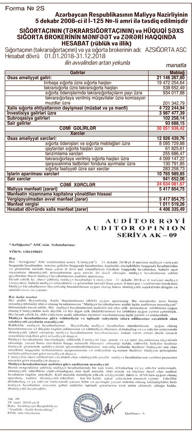 “Azsığorta” ASC 2018-ci ili 4 milyon 406 min manat xalis mənfəət ilə başa vurub. Müqayisə üçün qeyd edək ki, Şirkət 2017-ci ili 3 milyon 65 min manat zərər ilə bağlamışdı.