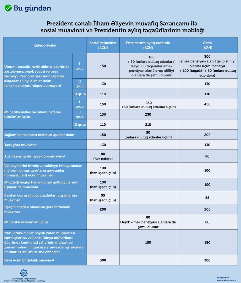 Əmək və Əhalinin social Müdafiəsi Nazirliyinin yaydığı məlumata görə, bu gündən 14 kateqoriya üzrə sosial müavinətlər və 7 kateqoriya üzrə Prezident təqaüdləri orta hesabla 100 faiz artırılır