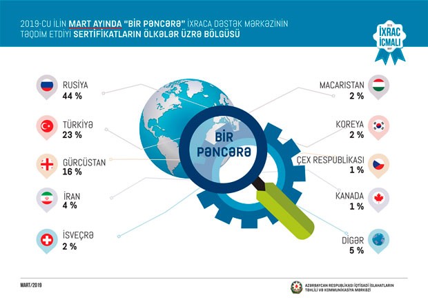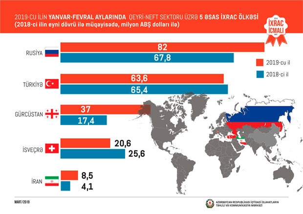 Cari ilin ilk iki ayı ərzində Rusiyaya 82 milyon, Türkiyəyə 63,6 milyon, Gürcüstana 37 milyon, İsveçrəyə 20,6 milyon və İrana 8,5 milyon ABŞ dolları dəyərində qeyri-neft sektoruna aid mal ixrac olunub. 2018-ci ilin müvafiq dövrü ilə müqayisədə 2019-cu ilin yanvar-fevral ayları ərzində Rusiyaya qeyri-neft ixracı 21%, Gürcüstana 13% və İrana 2,1 dəfə artıb.