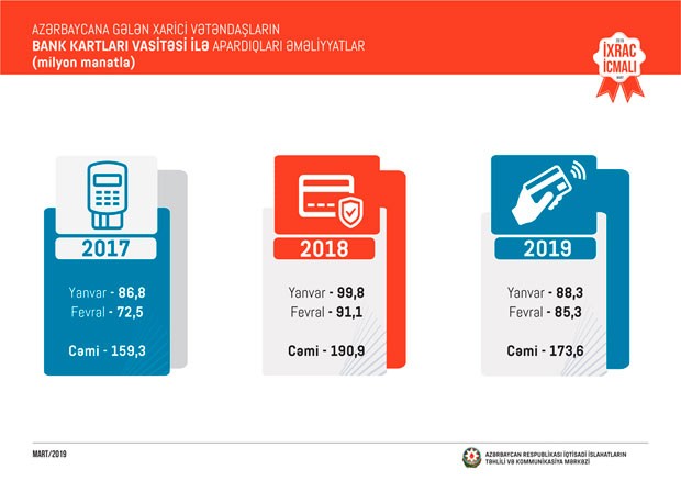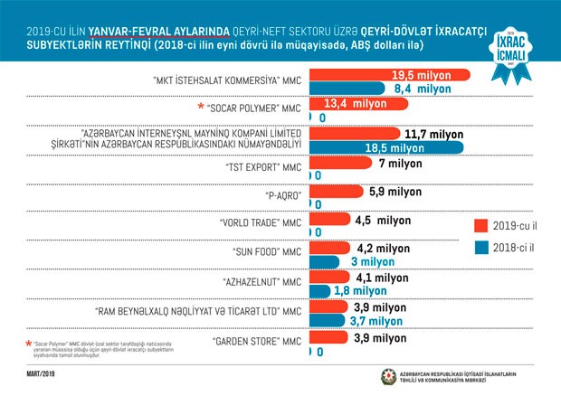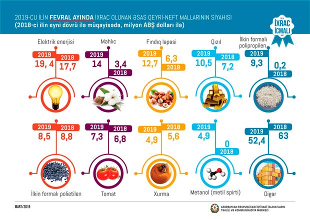 2019-cu ilin fevral ayında isə qeyri-neft sektoru üzrə ixrac 144 milyon ABŞ dolları təşkil edib. 2019-cu ilin fevral ayında qeyri-neft sektoruna aid ən çox mal ixrac edilən ölkələrin siyahısında Türkiyə (38,3 milyon ABŞ dolları) birinciliyə yüksəlib. Bu siyahıda Rusiya ikinci (35,7 milyon ABŞ dolları) və Gürcüstan üçüncü (23,4 milyon ABŞ dolları) olub.