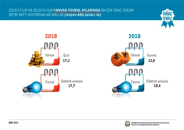 2019-cu ilin yanvar-fevral ayları ərzində ixrac edilən qeyri-neft sektoruna aid malların siyahısında elektrik enerjisi (30,5 milyon ABŞ dolları) birinci olub. Bu siyahıda mahlıc (25,9 milyon ABŞ dolları) ikinci, qabığı təmizlənmiş meşə fındığı isə (24,7 milyon ABŞ dolları) üçüncü yerdə qərarlaşıb.