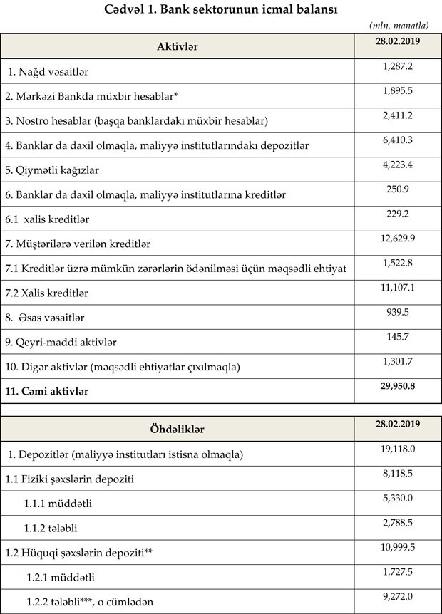 Maliyyə Bazarlarına Nəzarət Palatasının yaydığı məlumata görə, 28 fevral 2019-cu il tarixinə Azərbaycanda fəaliyyət göstərən bankların cəmi aktivləri 29 milyard 950.8 milyon manat, cəmi öhdəlikləri isə 25 milyard 708 milyon manat təşkil edib.