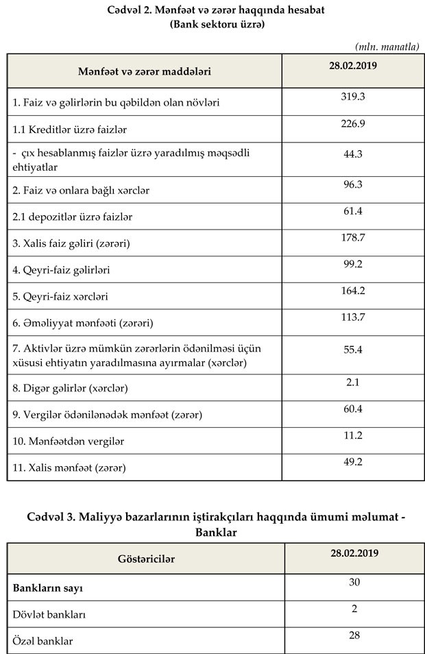Fevral ayında bankların əməliyyat mənfəəti 113.7 milyon manat, xalis mənfəəti isə 49.2 milyon manat təşkil edib.