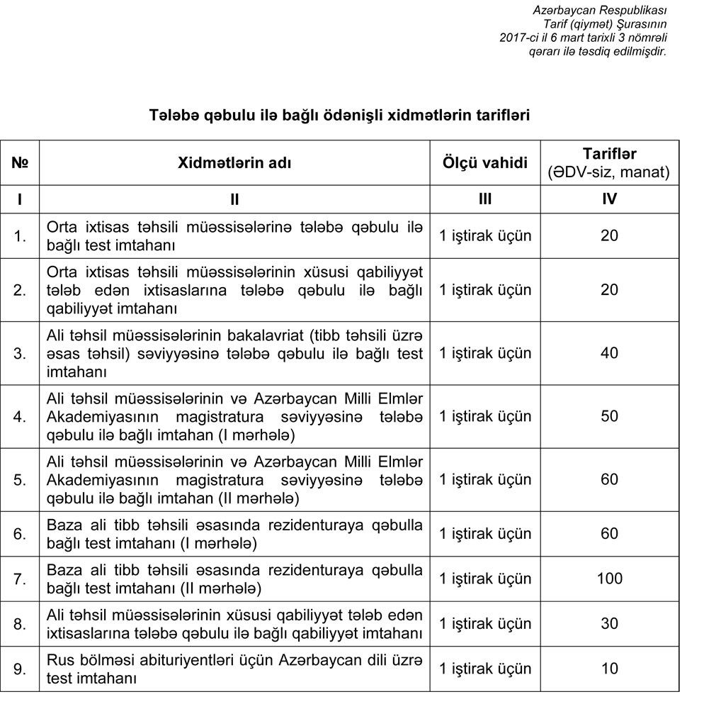 Belə ki, Dövlət İmtahan Mərkəzinin müraciəti və təklifləri nəzərə alınmaqla tələbə qəbulu ilə bağlı ödənişli xidmətlərin tarifləri Azərbaycan Respublikası Nazirlər Kabinetinin 2017-ci il 8 fevral tarixli müvafiq qərarları ilə təsdiq edilən qaydalara uyğun 9 qrup üzrə təsnifatlaşdırılmaqla imtahanın növündən asılı olaraq 10-100 manat arasında müəyyənləşdirilmişdir.