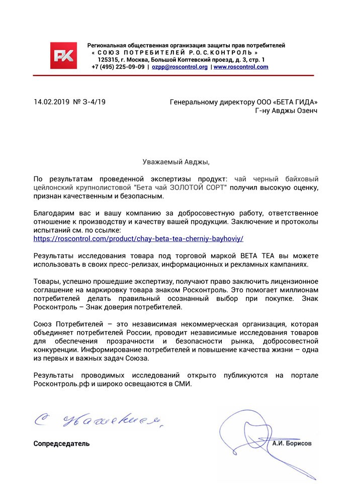Nüfuzlu "Roskontrol" təşkilatının bu qiymətləndirməsi BETA şirkətinə etibar edən milyonlarla istehlakçının məhsul alarkən doğru və şüurlu seçiminə, ən yaxşı və təhlükəsiz məhsul almasına köməklik göstərir. Aparılan sınaqların nəticələri açıq şəkildə "Roskontrol" saytında yerləşdirilirərək media tərəfindən geniş formada işıqlandırılıb.