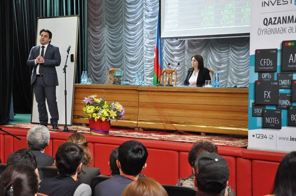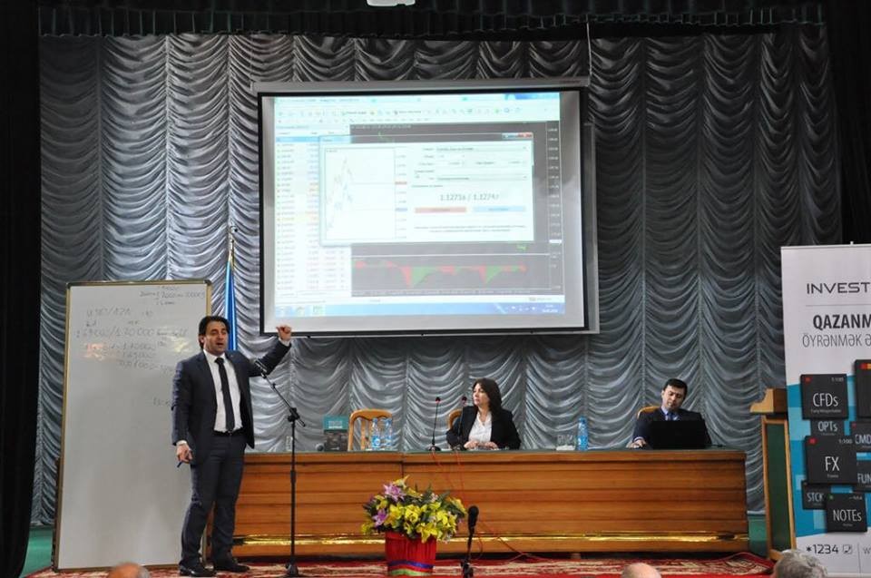 Sonra Rövşən Məmmədov Maliyyə bazarları – Birjalar haqqında, birjanın növləri, birjanın iştirakçıları; Birjada ticarətin motivləri; Maliyyə aktivlərinin alış və satışından mənfəət əldə etmək imkanı; Marjinal ticarət. Kredit çiyni; MetaTrader 4 (ticarət platforması) izahı; Analitik təhlil üsulları; Best İnvestor – yarışması haqqında geniş məlumat verib.