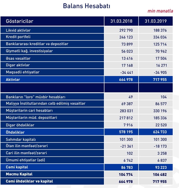 31 Mart 2019-cu il tarixində "RabitəBank" 717 milyon 955 min manat cəmi aktivlərə malik olub. Aktivlərin 334 milyon 34 min manatını kredit portfeli (müştərilərə verilən kreditlər) təşkil edib.