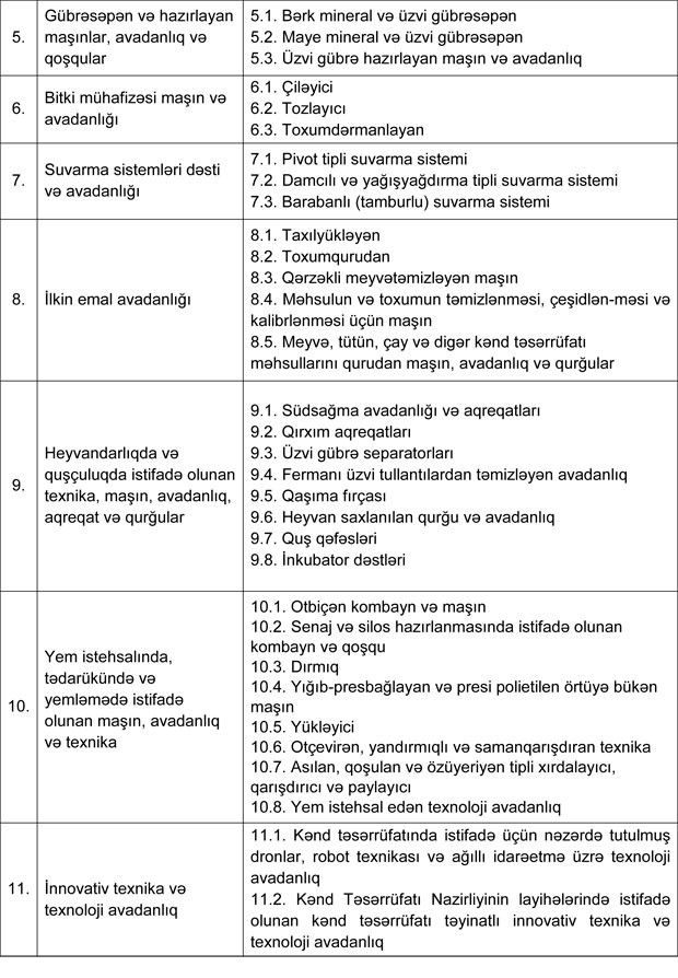 Kənd Təsərrüfatı Nazirliyi güzəşt tətbiq edilən kənd təsərrüfatı texnikalarının siyahısını genişləndirib. Yenilənmiş siyahıda 11 təyinat istiqaməti üzrə 60-dan artıq texnika və avadanlıq növü yer alıb.