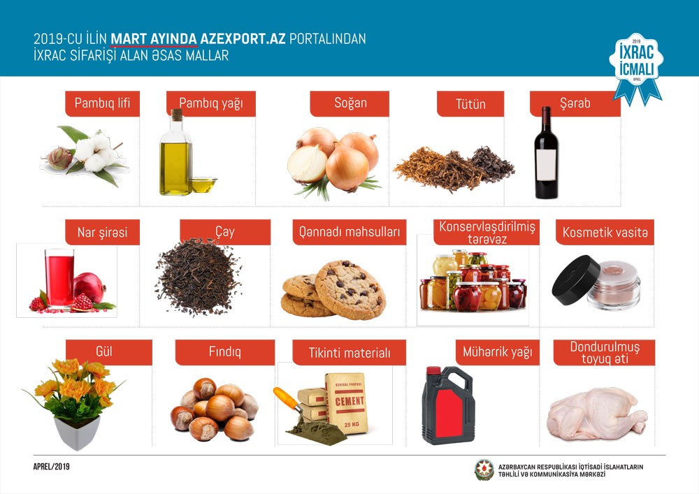 Cari ilin mart ayında ən çox ixrac sifarişi pambıq lifi, pambıq yağı, soğan, tütün, şərab, nar şirəsi, çay, qənnadı məhsulları, konservləşdirilmiş tərəvəz, kosmetik vasitə, gül, fındıq, tikinti materialı, mühərrik yağı, dondurulmuş toyuq əti, biyan kökü və s. mallara daxil olub.