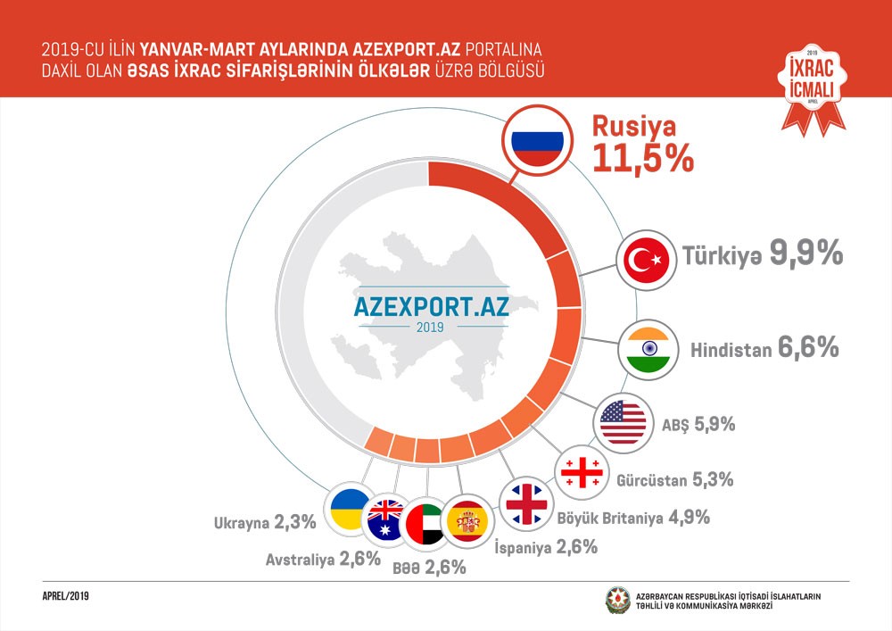 “İxrac İcmalı”nda 2019-cu ilin yanvar-mart ayları ərzində Azexport.az portalına daxil olan ixrac sifarişləri barədə də məlumat verilib. Göstərilib ki, 2019-cu ilin yanvar-mart aylarında Azexport.az portalına 178,4 milyon ABŞ dolları dəyərində ixrac sifarişləri daxil olub. Bu ilin mart ayında portala daxil olan ixrac sifarişlərinin dəyəri isə 32,8 milyon ABŞ dolları təşkil edib. Mart ayı ərzində portala daxil olan ixrac sifarişlərinin ilk beşliyində isə Rusiya(11,5%), Türkiyə (9,9%), ABŞ (7%), Hindistan (6,6%) və Gürcüstan (5,3%) qərarlaşıb.