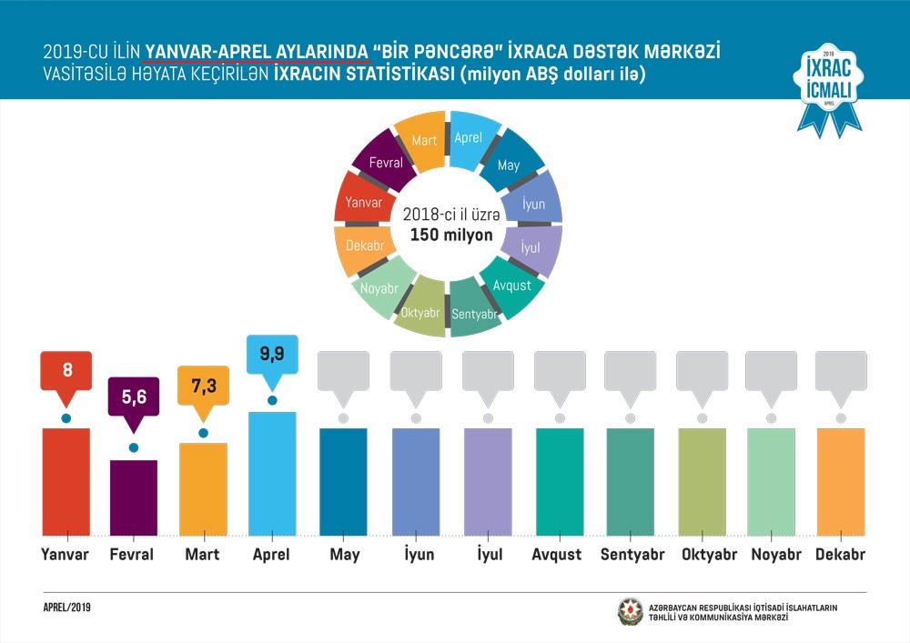 Həmçinin “İxrac İcmalı”nda göstərilib ki, bu ilin aprel ayında “Bir Pəncərə” İxraca Dəstək Mərkəzi vasitəsi ilə həyata keçirilən qeyri-neft ixracının dəyəri isə 9,9 milyon ABŞ dolları olub. 2019-cu ilin yanvar-aprel ayları ərzində “Bir Pəncərə” İxraca Dəstək Mərkəzi tərəfindən yüzlərlə sahibkara ixracla bağlı müvafiq sertifikatlar verilib və bunun nəticəsində 30,5 milyon ABŞ dolları dəyərində qeyri-neft ixracı həyata keçirilib.