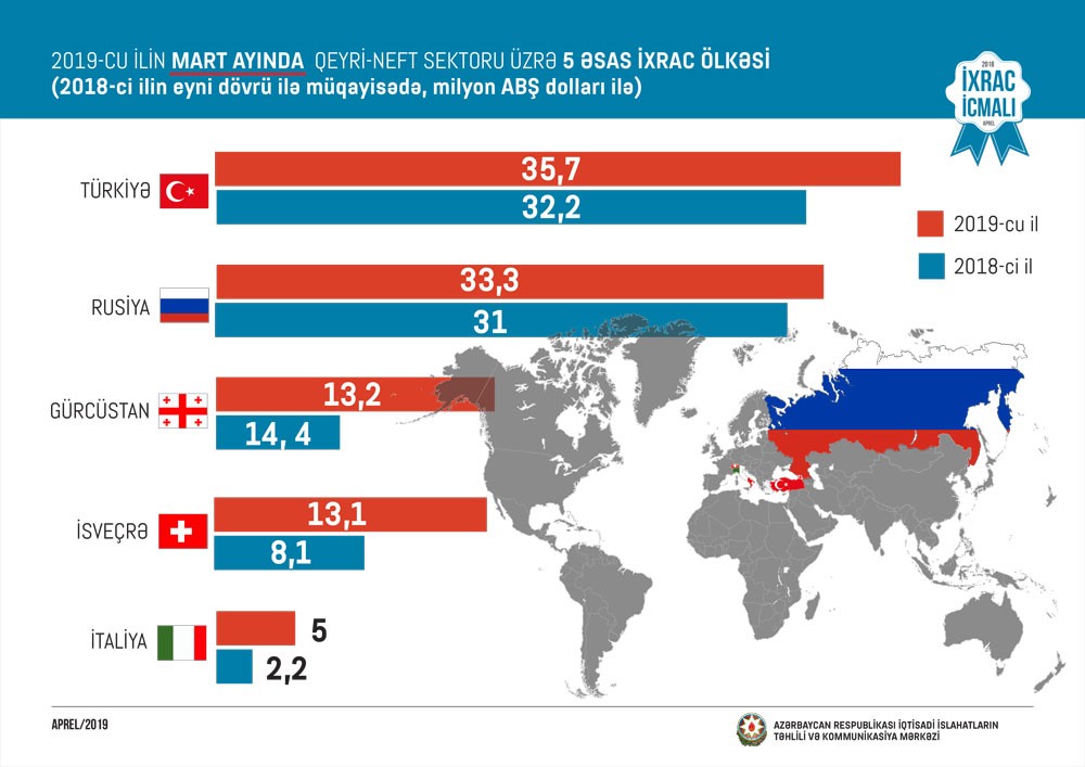 2018-ci ilin müvafiq dövrü ilə müqayisədə 2019-cu ilin ilk üç ayında Rusiyaya qeyri-neft ixracı 17%, Türkiyəyə 2%, Gürcüstana 58%, İtaliyaya 74% artıb.