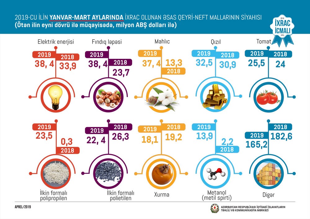 2018-ci ilin müvafiq dövrü ilə müqayisədə cari ilin yanvar-mart aylarında pambıq lifinin ixracı 2,8 dəfə, alkoqollu və alkoqolsuz içkilərin ixracı 2,8 dəfə, plastmassa və onlardan hazırlanan məmulatların ixracı 50 faiz, kimya sənayesi məhsullarının ixracı 42 faiz, pambıq ipliyinin ixracı 34 faiz, meyvə-tərəvəzin ixracı 28 faiz, elektrik enerjisinin ixracı 13 faiz artıb.
