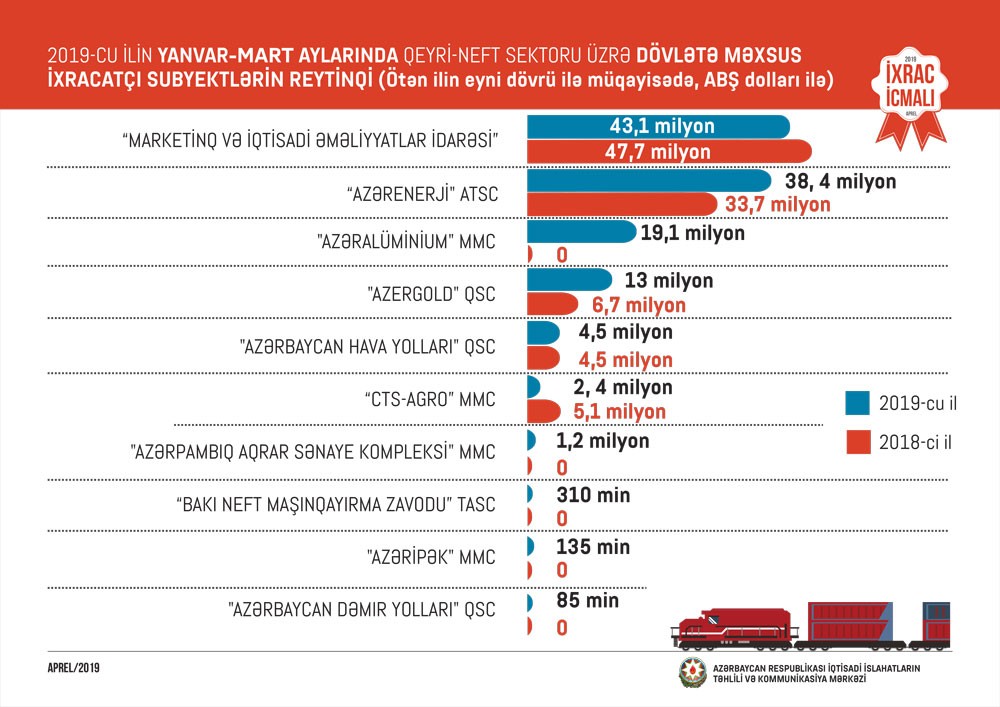 İcmalın bu sayında göstərilir ki, 2019-cu ilin yanvar-mart ayları ərzində Azərbaycan Respublikasının ixracı 4,5 milyard ABŞ dolları təşkil edib və ötən ilin müvafiq dövrünə nisbətən 1,1 milyard ABŞ dolları və ya 34 faiz artıb. Bu müddətdə qeyri-neft sektoru üzrə ixrac isə 415 milyon ABŞ dolları olub. 2018-ci ilin müvafiq dövrü ilə müqayisədə 2019-cu ilin yanvar-mart ayları ərzində qeyri-neft sektoru üzrə ixrac 59 milyon ABŞ dolları və ya 16,5 faiz artıb. Bu ilin birinci rübü ərzində Rusiyaya 115 milyon, Türkiyəyə 99 milyon, Gürcüstana 50 milyon, İsveçrəyə 33,7 milyon və İrana 12,7 milyon ABŞ dolları dəyərində qeyri-neft sektoruna aid mal ixrac edilib.