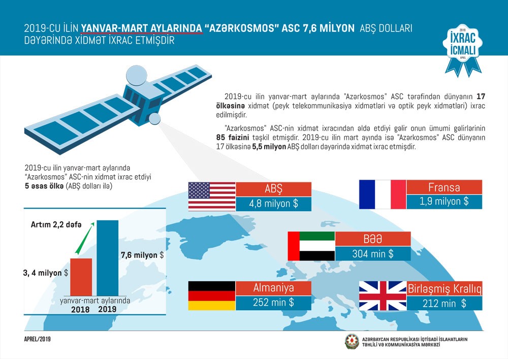 “İxrac İcmalı”nda xidmət ixracına da yer verilib. Bildirilir ki, 2019-cu ilin birinci rübündə “Azərkosmos” ASC tərəfindən dünyanın 17 ölkəsinə xidmət (peyk telekommunikasiya xidmətləri və optik peyk xidmətləri) ixrac edilib. “Azərkosmos” ASC-nin xidmət ixracından əldə etdiyi gəlir onun ümumi gəlirlərinin 85 faizini təşkil edib. 2019-cu ilin mart ayında isə “Azərkosmos” ASC dünyanın 17 ölkəsinə 5,5 milyon ABŞ dolları dəyərində xidmət ixrac edib. “Azərkosmos” ASC-nin 2019-cu ilin yanvar-mart aylarında xidmət ixracı həyata keçirdiyi əsas ölkələr ABŞ, Fransa, BƏƏ, Almaniya, Birləşmiş Krallıqdır.