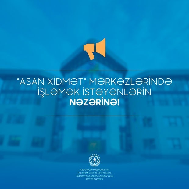 Prezident yanında Vətəndaşlara Xidmət və Sosial İnnovasiyalar üzrə Dövlət Agentliyi yeni açılacaq “ASAN xidmət” mərkəzlərində çalışmaq istəyənlərə müraciət edib.