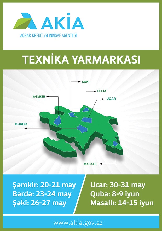 Fermerləri kənd təsərrüfatı texnikası təchizatçıları və maliyyə qurumları ilə tanış etmək, eləcə də texnika satışı şərtləri barədə məlumatlandırmaq məqsədi Aqrar Kredit və İnkişaf Agentliyi 20 may – 15 iyun 2019-cu il tarixlərində ölkənin 6 rayonunda (Şəmkir, Bərdə, Şəki, Ucar, Quba, Masallı) texnika yarmarkaları keçirəcək.