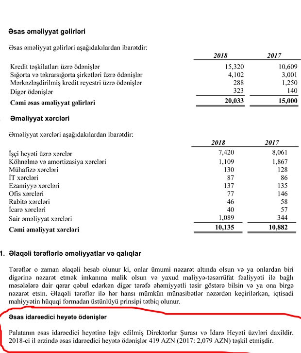 Əsas diqqəti cəlb edən rəhbərliyə (əsas idarəedici heyətə ) ödənişlərin kəskin azalmasıdır. Əsas idarəedici heyətə ödənişlər Palatanın əsas idarəedici heyətinə ləğv edilmiş Direktorlar Şurası və İdarə Heyəti üzvləri daxildir. 2018-ci il ərzində əsas idarəedici heyətə cəmi ödənişlər 419 min manat təşkil edib. Bu, 2017-ci illə müqayisədə təxminən 5 dəfə azdır. 2017-ci ildə əsas idarəedici heyətə ödənişlər 2 milyon 79 min manat təşkil etmişdi.