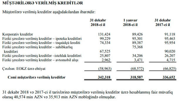 Fiziki şəxlərə verilmiş təqaüdçü krediti 22,5% azalaraq 74 milyon 334 min manata, istehlak kreditləri 1,5% azalaraq 25 milyon 807 min manata, avtomobil alışı üçün verilən kreditlər 37,2% azalaraq 2 milyon 962 min manata düşüb. Fiziki şəxslərə verilmiş sahibkarlıq kreditləri isə 25% azalaraq 67 milyon 525 min manata geriləyib. Korporativ və ipoteka kreditlərindəki artım bu azalmaları artıqlaması ilə bağlayıb.