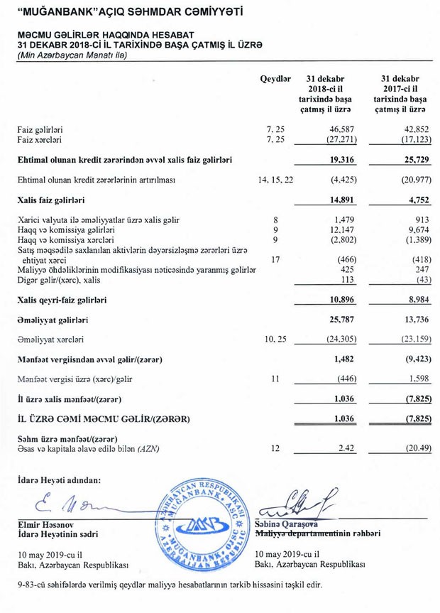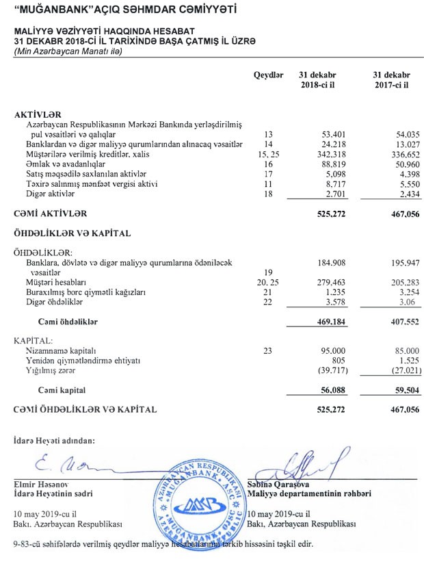 “Muğanbank” ASC 31 dekabr 2018-ci il tarixində başa çatmış il üzrə Maliyyə Hesabatlarının Beynəlxalq Standartlarına Uyğun Hazırlanmış Maliyyə Hesabatlarını dərc edib.