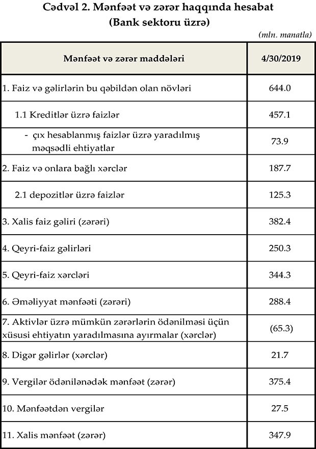 Maliyyə Bazarlarına Nəzarət Palatasının aylıq statistikasına görə, 4 ay ərzində bankların faiz gəlirləri 644 milyon manat (illik müqayisədə 14,75% çox), faiz xərcləri 187,7 milyon manat (6,7% az), qeyri-faiz gəlirləri 250,3 milyon manat (57,1% çox), qeyri-faiz xərcləri 344,3 milyon manat (5,7% çox), aktivlər üzrə mümkün zərərlərin ödənilməsi üçün xüsusi ehtiyatların yaradılmasına ayırmaları 8,6 milyon manat (96,45% az), digər gəlirləri 21,7 milyon manat (12,8 dəfə çox), mənfəət vergisi ödəmələri isə 27,5 milyon manat (2,7 dəfə çox) təşkil edib.