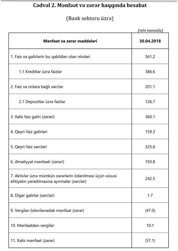 Bank sektoru 2019-cu ilin yanvar-aprel dövrünü 347.9 milyon manat xalis mənfəət ilə başa vurub.Halbuki, sektor ötən ilin eyni dövrünü 57.1 milyon manat xalis zərərlə bağlamışdı. Ötən ilin ilk 4 ayında banklar aktivlər üzrə mümkün zərərlərin ödənilməsi üçün xüsusi ehtiyatın yaradılmasına 242.5 milyon manat ayırmışdılar. Bu ilin eyni dövründə ehtiyatın 65.3 milyon manatı azad olaraq mənfəətə əlavə olunub.