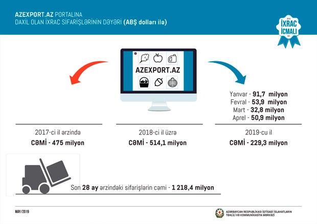 Bu ilin ilk 4 ayında Azexport.az portalına 229 milyon ABŞ dolları dəyərində ixrac sifarişi daxil olub