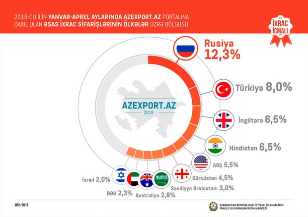 2018-ci ilin müvafiq dövrü ilə müqayisədə 2019-cu ilin ilk dörd ayında Rusiyaya qeyri-neft ixracı 22 faiz, Türkiyəyə 16 faiz, Gürcüstana 19 faiz, İsveçrəyə 13 faiz, İtaliyaya 2 dəfə artıb.