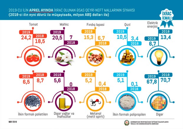 2019-cu ilin aprel ayında qeyri-neft sektoru üzrə ixracda tomat (24 milyon ABŞ dolları) birinci, daranmaya məruz qalmamış pambıq lifi (20,5 milyon ABŞ dolları) ikinci, qabığı təmizlənmiş meşə fındığı (15 milyon ABŞ dolları) üçüncü olub.