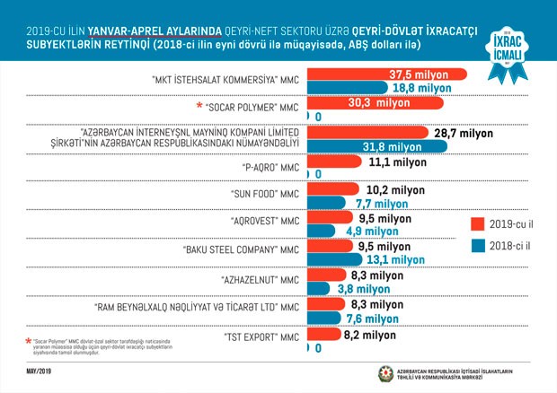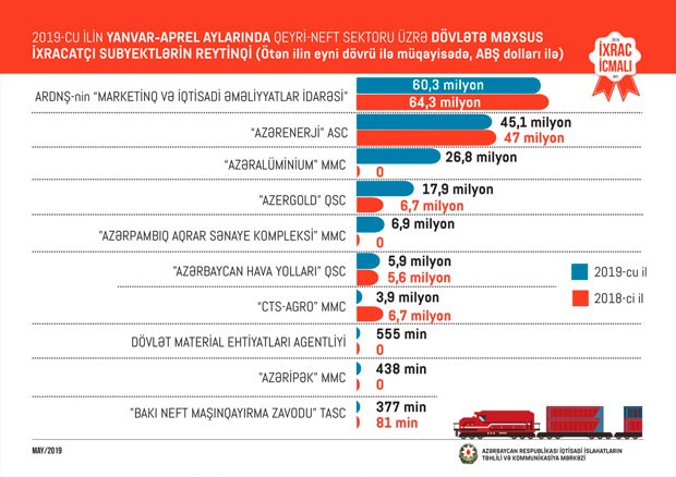 2019-cu ilin aprel ayında isə qeyri-neft sektoru üzrə ixrac 167 milyon ABŞ dolları təşkil edib. 2018-ci ilin aprel ayı ilə müqayisədə bu ilin aprel ayında qeyri-neft sektoru üzrə ixrac 38 milyon ABŞ dolları və ya 29 faiz artıb. Cari ilin aprel ayında qeyri-neft sektoruna aid ən çox mal Rusiyaya (49,6 milyon ABŞ dolları), Türkiyəyə (48,6 milyon ABŞ dolları) və Gürcüstana (12 milyon ABŞ dolları) ixrac edilib.