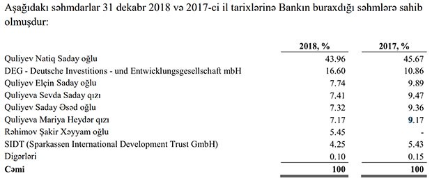 “Marja” Bankın İllik hesabatına istinadən xəbər verir ki, əsas səhmdar Quliyev Natiq Saday oğlunun payı 2017-ci ilin sonunda 45.67% ikən, 2018-ci ilin sonunda 43.96%-ə düşüb. DEG-in payı isə 10.86%-dən 16.60%-ə yüksəlib.