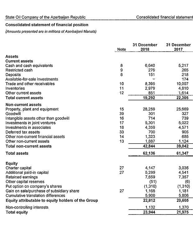 Audit olunmuş maliyyə hesabatlarına görə SOCAR Qrupunun ümumi aktivləri ötən il 62,1 milyard manat, bunun müqabilində ümumi borc öhdəlikləri 13,7 milyard manat təşkil etmişdir. SOCAR-ın cəmi kapitalı əvvəlki illə müqayisədə artaraq 24 milyard manata çatmışdır.