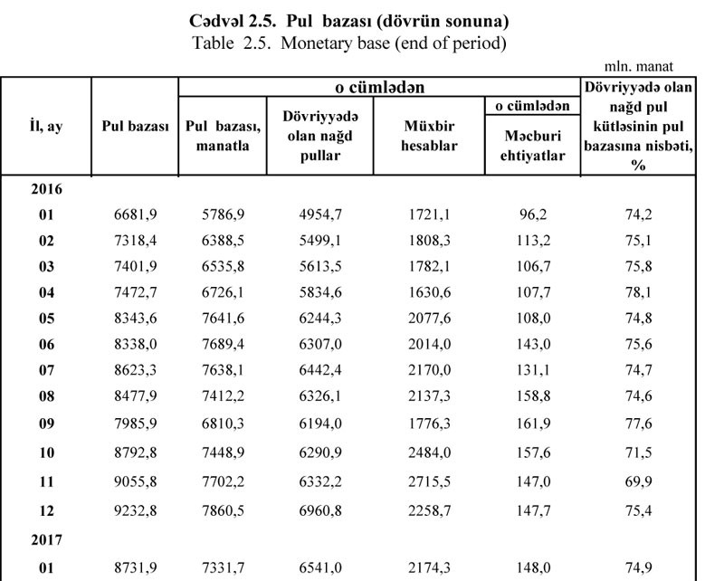 Ötən ilin sonu ilə müqayisəd pul bazası 500,9 milyon manat, manatla pul bazası isə 528,8 milyon manat azalıb.